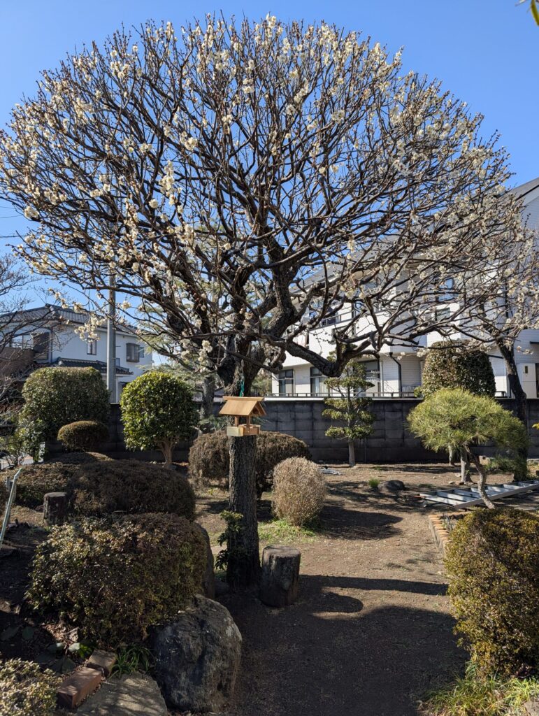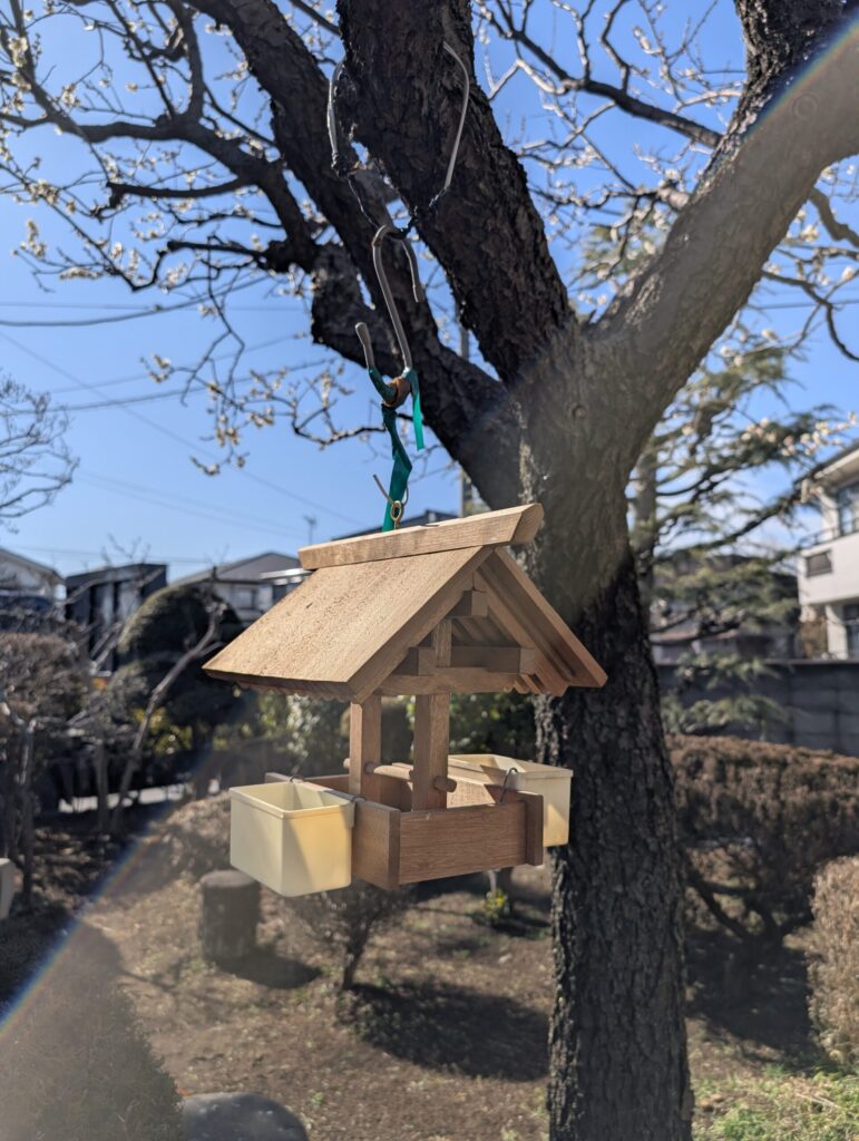 梅の枝にしっくりと馴染んでいる新しい餌箱、施主様から「毎日たくさんの野鳥たちが、休憩にやってくるんですよ」と、嬉しいお声をいただきました。